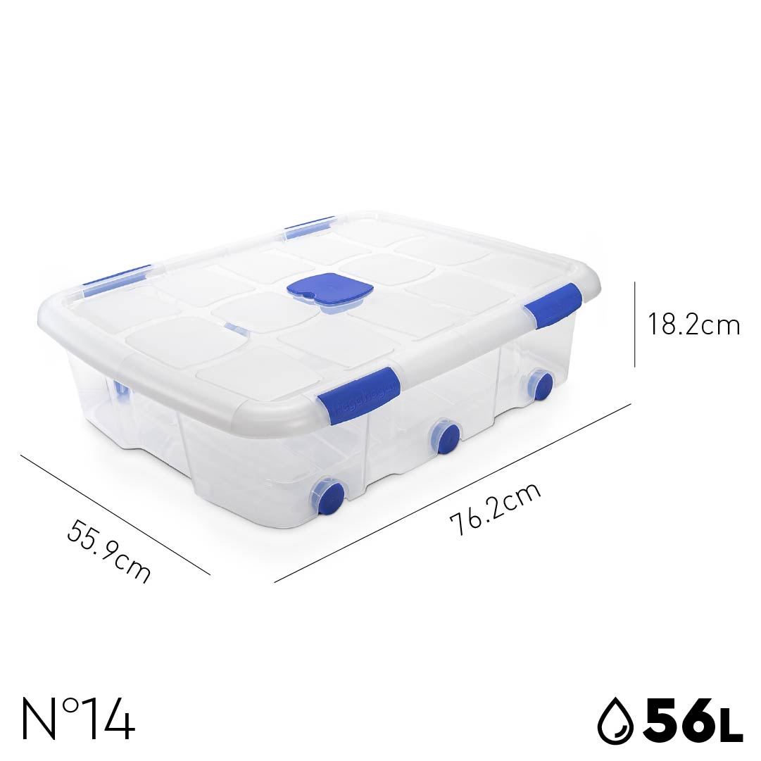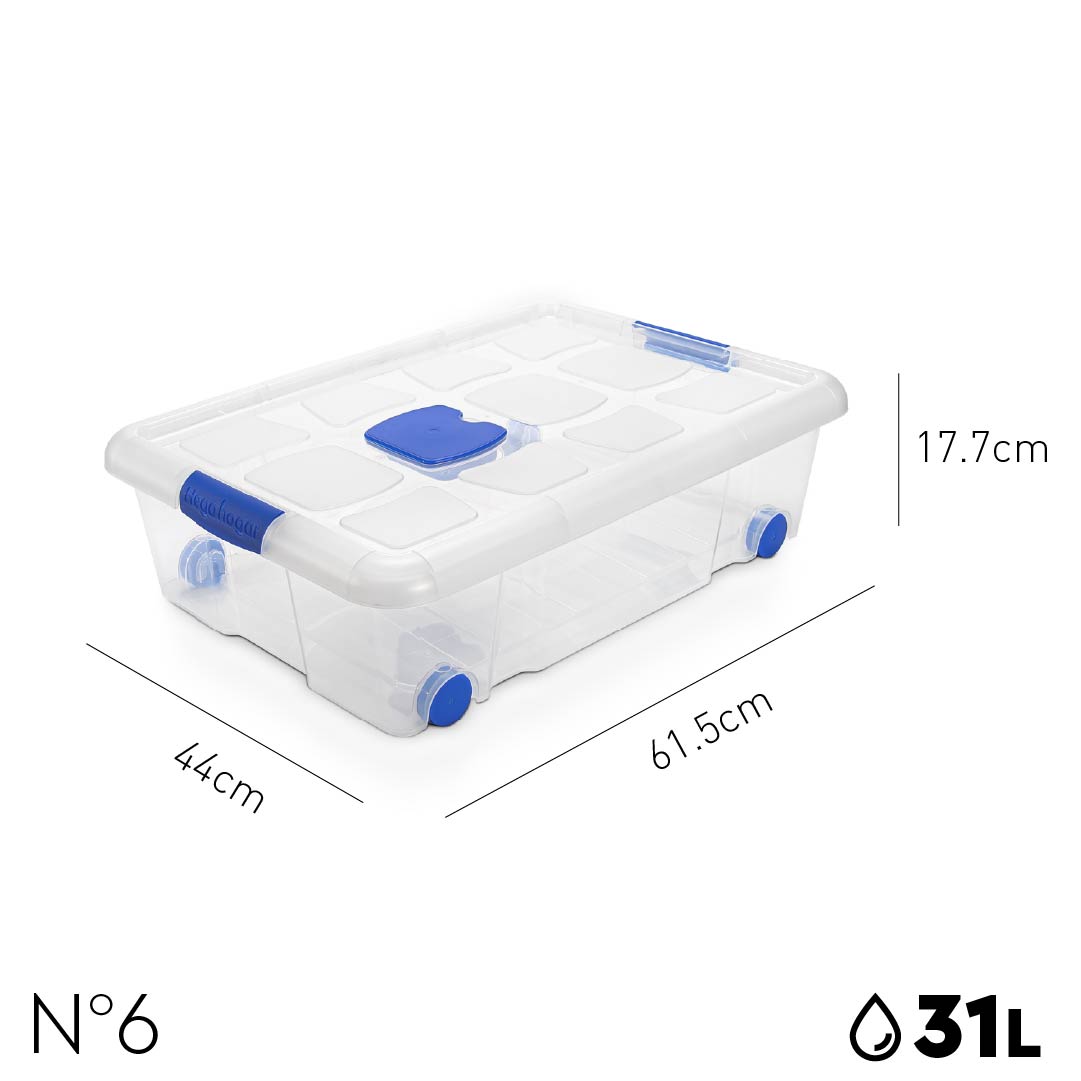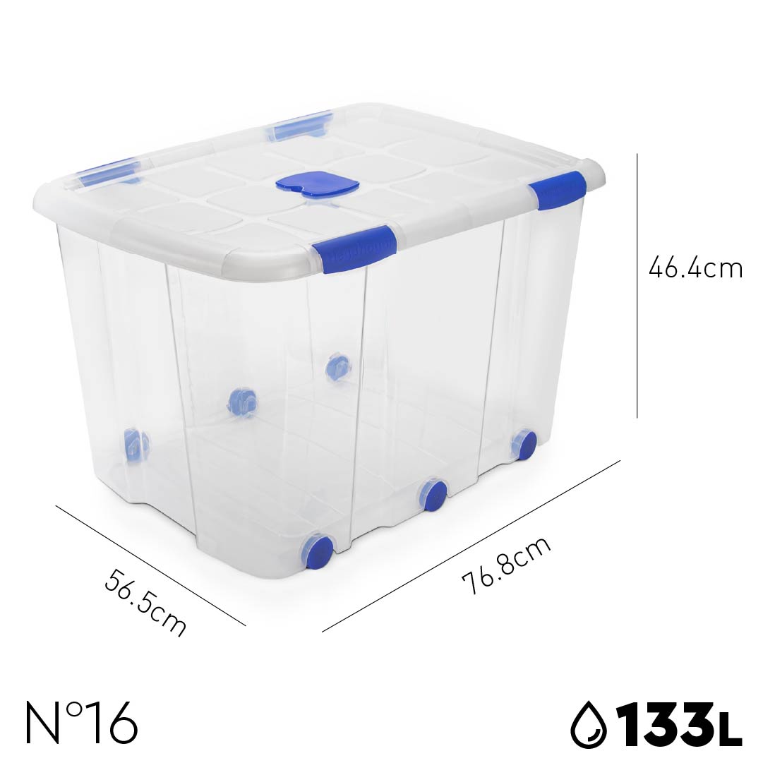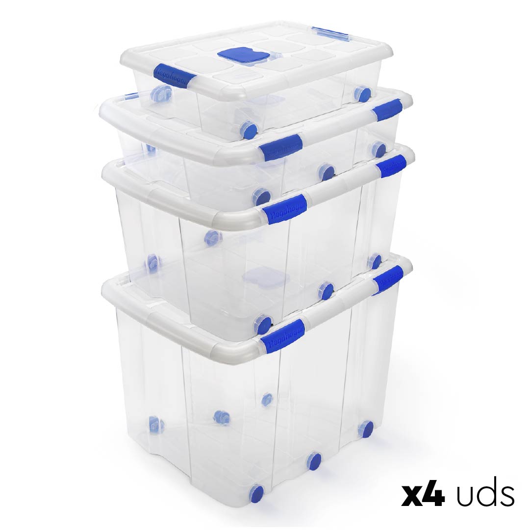 El Set de 4 Cajas New Box Nº 6-14-15-16 ofrece una solución versátil y eficaz para almacenar y organizar todo tipo de objetos. Con capacidades de 31, 56, 100 y 133 litros, este conjunto es perfecto para quienes necesitan una variedad de tamaños en una misma línea de diseño y calidad. Fabricadas en plástico resistente y transparente, permiten identificar fácilmente el contenido sin necesidad de abrirlas.